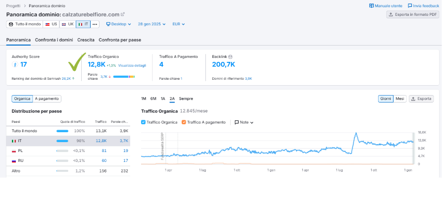 Belfiore è un marchio italiano di calzature artigianali con uno store fisico a Milano e un e-commerce che vende sia in Italia che all’estero. Il progetto ha previsto la creazione e l’ottimizzazione dei contenuti del sito, oltre alla definizione di una strategia SEO personalizzata e di un piano editoriale per il blog.